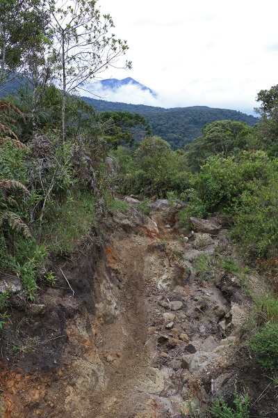 A descida até o ponto de pernoite é íngreme, com uma declividade não aconselhada para fins de manejo e conservação da trilha, o que se comprova pelo grande nível de erosão do percurso. A condição do terreno estava ainda pior por causa da chuva da véspera, o que transformou a terra em lama e as botas em patins em alguns trechos.