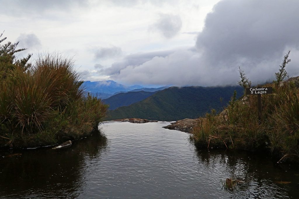 A trilha segue por entre as pedras e, nesse trecho sobreposto ao Circuito 5 Lagos, é sinalizada por estacas de madeira pintadas de vermelho na ponta. Após dois quilômetros de caminhada, chegamos à Cachoeira 5 Lagos, um dos atrativos do percurso. Apesar da temperatura, tanto ambiente quanto da água, não a tornar convidativa o suficiente para um mergulho, a paisagem é de tirar o fôlego. A cachoeira se debruça na beira da montanha e despenca displicentemente morro abaixo, enquanto a sinuosidade da serra se estende por todas as direções e mostra a imponência da Serra da Mantiqueira.