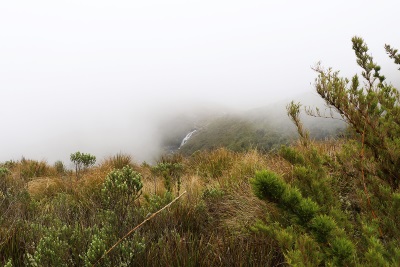 Descemos gradualmente em direção ao Vale do Aiuruoca, por onde passa o rio, e assistimos a mudança na vegetação, que aos poucos se transforma em floresta. Os arbustos da altitude dão lugar às árvores, e o clima mais seco dá lugar à umidade. A paisagem ganha contornos e cores mais tradicionais da Mata Atlântica. A trilha passa próxima à Cachoeira do Aiuruoca e, mesmo sem vê-la, é possível ouvir o barulho da queda d’água de 40 metros. Apenas um quilômetro depois, consegui enxergar a cachoeira, mas apenas por breves minutos antes de uma nuvem se intrometer e fazê-la desaparecer por detrás da neblina.