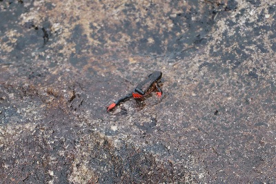 Durante nossa caminhada nesse trecho inicial, encontramos vários sapinhos. Quando parados, suas costas escuras se confundem com a rocha, mas basta se moverem para denunciarem sua presença por causa das suas patas vermelhas chamativas. Encontramos até mesmo um casal durante seu acasalamento. Nada mais justo, pois estamos em pleno período reprodutivo da espécie, que vai de setembro a abril, ao longo da época mais úmida. Nos outros meses do ano é praticamente impossível encontrar os sapos flamenguinhos que ficam refugiados em buracos em um estado parecido com a hibernação.